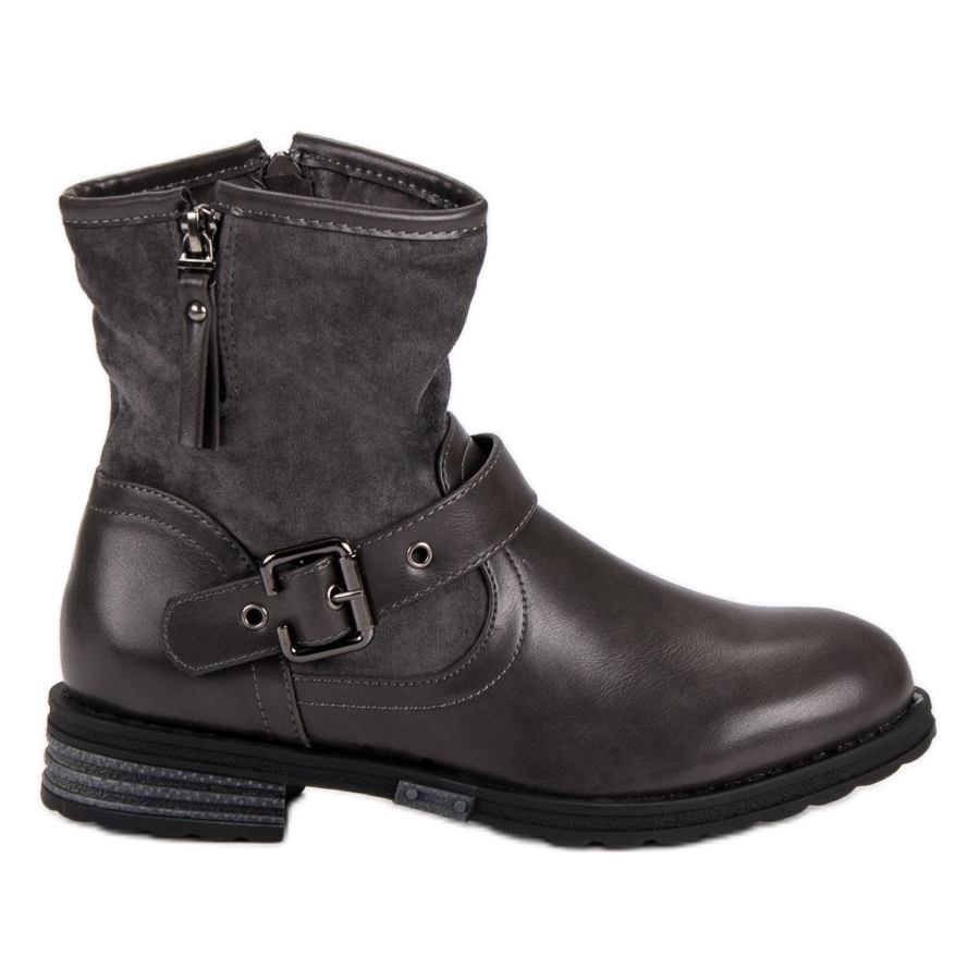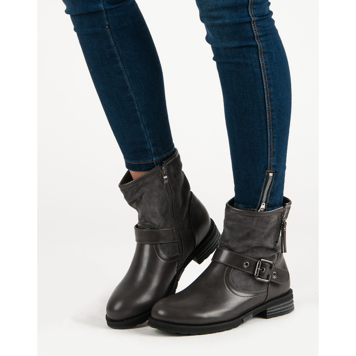 Aus hochwertigem grauem Faux-Wildleder und ökologischem Wildleder gefertigt, überzeugen diese Worker durch ihr elegantes, rockiges Design. Metallverzierungen, darunter eine auffällige Schnalle und ein Reißverschluss, verleihen einen Hauch von Avantgarde und machen sie zu einem unersetzlichen Element jeder Garderobe. Die dicke Profilsohle sorgt nicht nur für hervorragenden Halt, sondern auch für Komfort bei langen Spaziergängen.