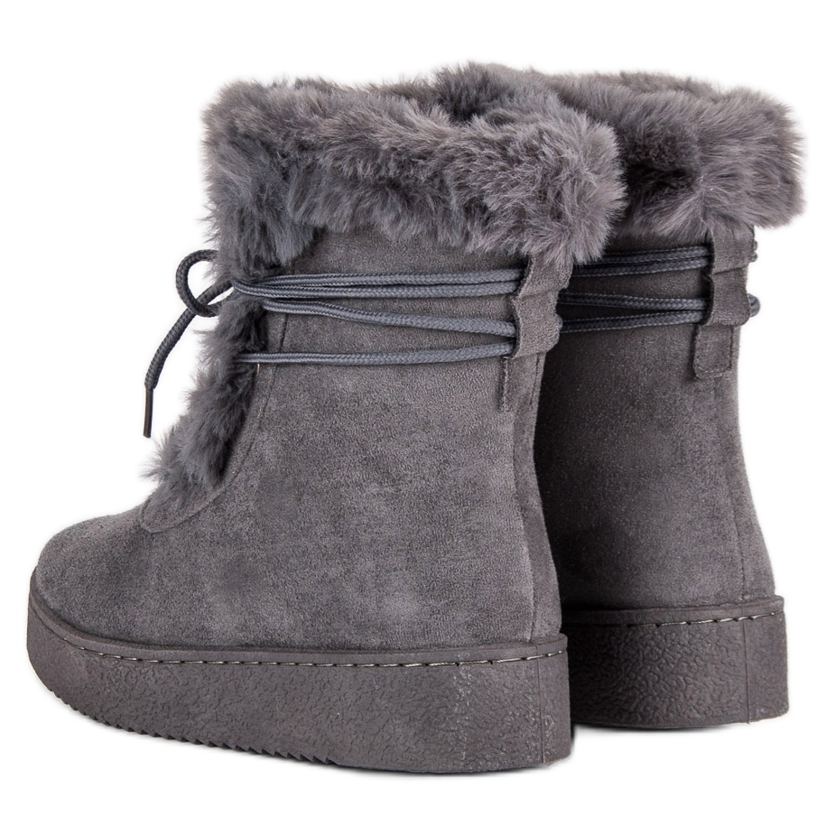 Die flache Sohle mit Profil sorgt für hervorragenden Halt auch auf rutschigem Untergrund und macht sie zu einem unersetzlichen Begleiter bei Winterspaziergängen. Die Innenseite der Schuhe ist mit angenehmem Fell isoliert, was nicht nur vor Kälte schützt, sondern auch für einen stilvollen Look sorgt. Die graue Farbe ist universell und passt perfekt zur Herbst-Winter-Garderobe, und das abstehende Fell am Obermaterial verleiht dem Ganzen einen eleganten Charakter.