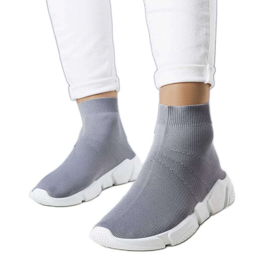 Die Sneaker zeichnen sich durch eine runde Spitze und einen hohen Schaft aus, was sie nicht nur modisch, sondern auch bequem macht. Die Höhe der Schuhe beträgt 13 cm und die Höhe des Plateauabsatzes beträgt nur 3,5 cm, was für Stabilität und Tragekomfort sorgt. Das weiße Gummi der Sohle kontrastiert perfekt mit dem dezenten Grau des Obermaterials und verleiht dem Ganzen einen frischen Charakter.