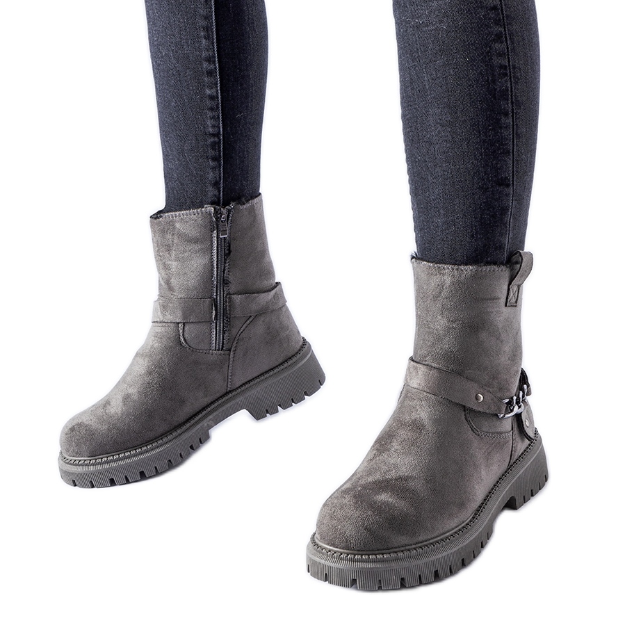 Graue isolierte Sedico-Stiefel (Modell E8217-5) -Stil und Bequemlichkeit für kalte Tage. Klassische, gedämpfte graue und subtile Kette als Detail machen die Stiefel die Winter- und Herbststilisierungen perfekt, von lässig bis etwas eleganter. Das obere ökologische Leder aus Wildleder sieht modisch und angenehm an die Berührung aus, und die Isolierung im Inneren sorgt auch bei niedrigen Temperaturen thermischer Komfort.