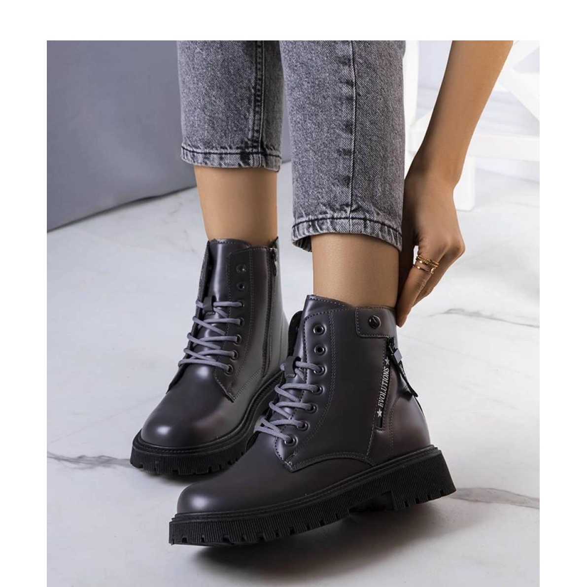 Dieses Modell verfügt über eine runde Nase und eine Standardnummerierung, wodurch es einfacher ist, die richtige Größe auszuwählen. Darüber hinaus können Sie mit dem Reißverschluss und der Schnürfaltigkeitsbefestigung sie perfekt zum Fuß anpassen. Die Fersenhöhe beträgt 4,5 cm, was nicht nur ein elegantes Erscheinungsbild, sondern auch die Bequemlichkeit des Gebrauchs verleiht.