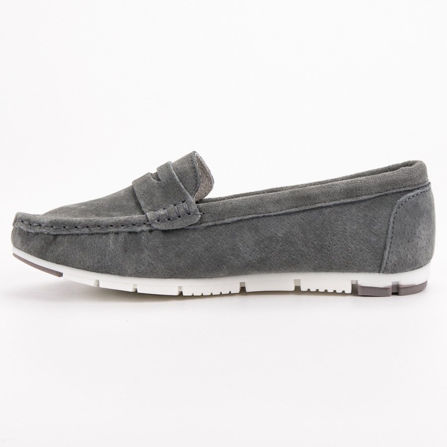Die weiße Sohle ist ein modischer Akzent, der dieses Modell von anderen unterscheidet und jedem Styling Frische und Leichtigkeit verleiht. Mokassins eignen sich perfekt für Sommerausflüge, zum Einkaufen oder zur Schule. Dank der universellen grauen Farbe passen sie zu vielen verschiedenen Stilen – sowohl urban als auch sportlich.