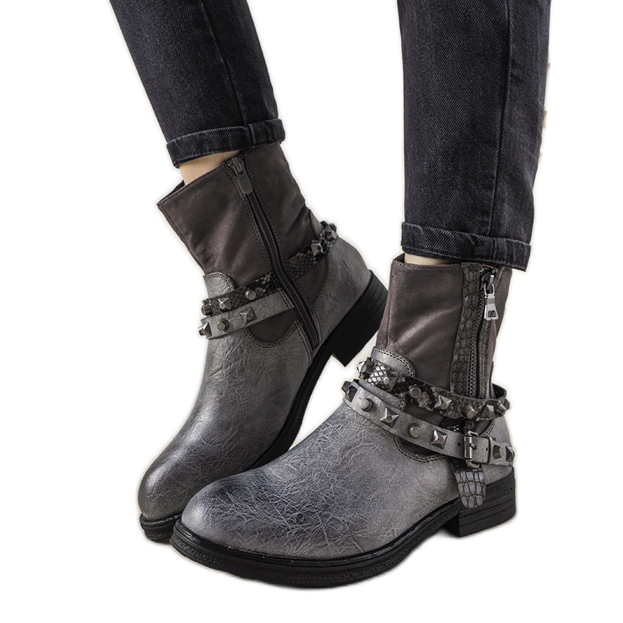 Elegante Frauenstiefel in einem grauen Farbton kombinieren einen klassischen Knöchelschnitt mit einem Rock -Akzent in Form von Bands, die mit Bolzen dekoriert sind. Sie werden aus ökologischem und ökologischem Skin kombiniert und werden eine großartige Ergänzung zu Herbst- und Winterstilisationen sein.