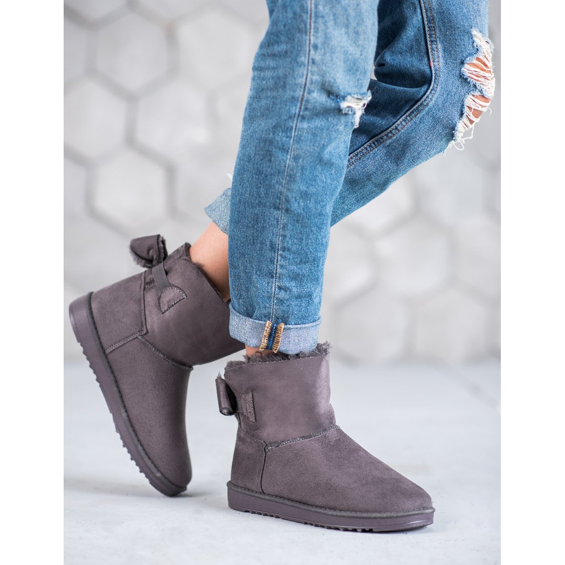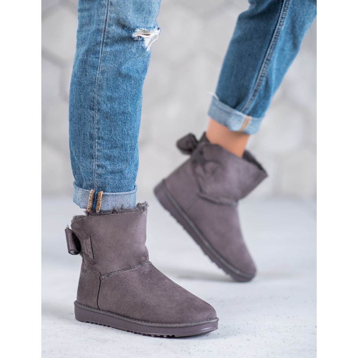 Graue Mukluks mit Schleife sind die perfekte Wahl für die kommende Herbst-Winter-Saison für jede Frau, die Wert auf die Kombination von Komfort und Stil legt. Aus ökologischem Wildleder gefertigt, sehen diese Schuhe nicht nur äußerst elegant aus, sondern umhüllen Ihre Füße auch angenehm und halten sie dank der Fellisolierung auf der Innenseite angenehm warm.