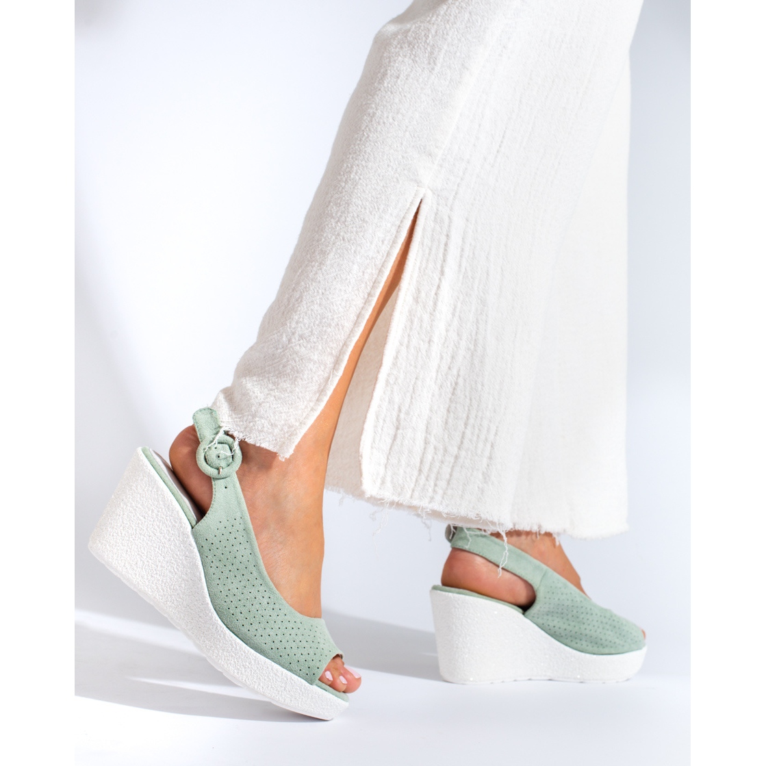 Die Sandalen haben einen offenen Absatz, der für Komfort und Bewegungsfreiheit sorgt. Sie bestehen aus hochwertigem, ökologischem Wildleder und sehen äußerst stilvoll aus. Die Innensohle aus Naturleder sorgt den ganzen Tag über für den Komfort Ihrer Füße. Dank eines 3 cm hohen Plateaus und eines bis zu 8 cm hohen Keils fühlen Sie sich selbstbewusst und feminin, ohne sich um Unannehmlichkeiten sorgen zu müssen.