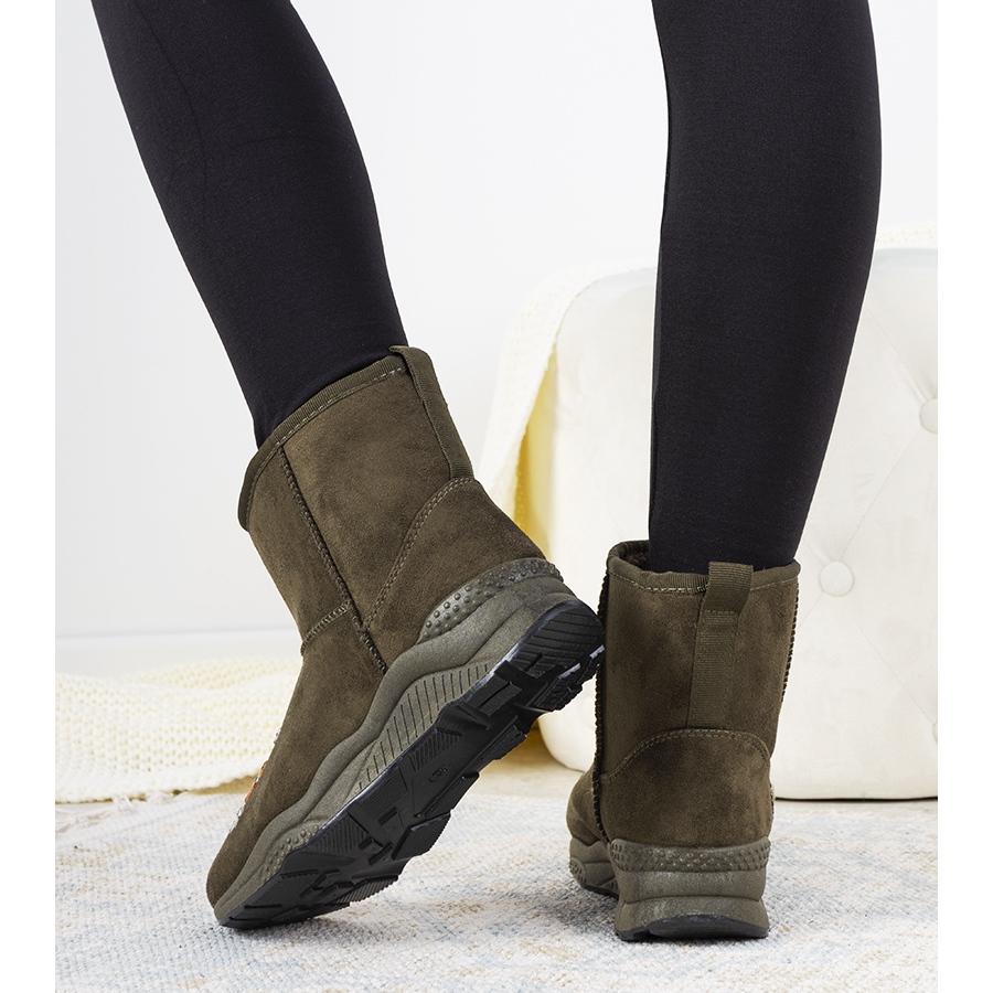 Arana -Stiefel sind ein Vorschlag für Wintertage - warm, komfortabel und stilvoll. Hergestellt aus Wildleder -ökologischem Leder in modischer, grüner Farbe mit weicher Pelzisolierung werden sie jeden Tag großartig funktionieren. Die Vorderseite des Oberen ist mit einem subtilen Motiv aus Zirkonblüten dekoriert, das den Schuhen einen eleganten Akzent verleiht.