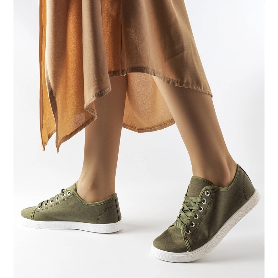 Stilvolle Sneaker -Frauen -Razan in einem olivgrünen Schatten (Olive). Niedrige, geschnürte Schuhe mit einem materiellen Obermaterial und einem Einsatz, auf einer weißen Gummi -Sohle - perfekt für alltägliche, Sommer- und Frühlingsstilisationen.