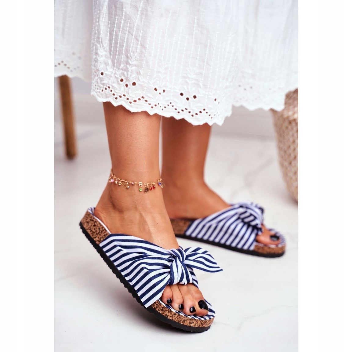 Eine elegante Schleife verleiht dem Ganzen einen einzigartigen Charme, erregt Aufmerksamkeit und betont die Weiblichkeit. Die dunkelblauen und weißen Streifen, mit denen die zehenstegsandalen bereichert sind, strahlen Stil und Frische aus und machen sie zu einer tollen Ergänzung zu Sommer-Styles, sowohl für den Strand als auch für die Stadt.