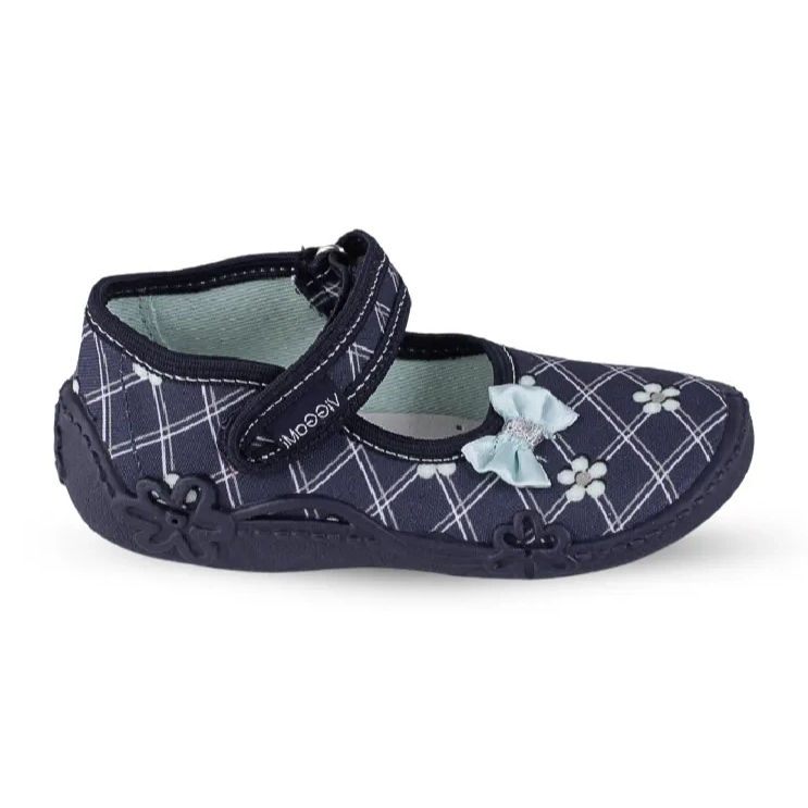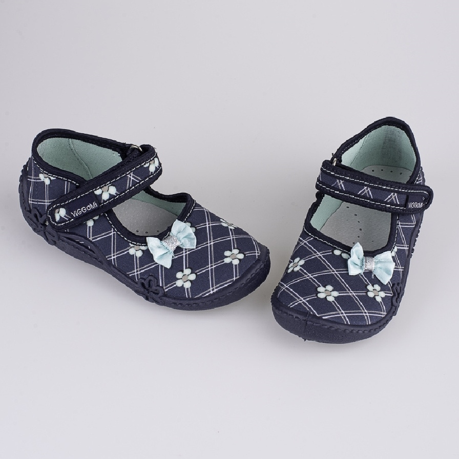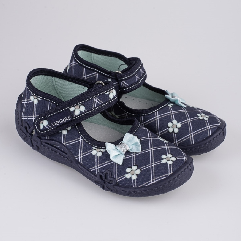 Bequeme Kinderschuhe Viggami Emma in einer universellen blauen Farbe mit dekorativem Druck. Entworfen für den täglichen Gebrauch zu Hause und im Kindergarten - bequem, sicher und einfach zu veranlassen, dank Klettverschluss.
