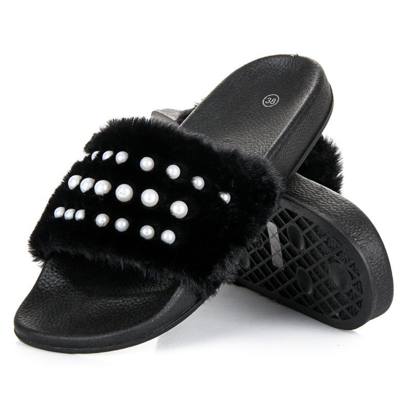 Details: Hausschuhe mit Fell und Perlen schwarz