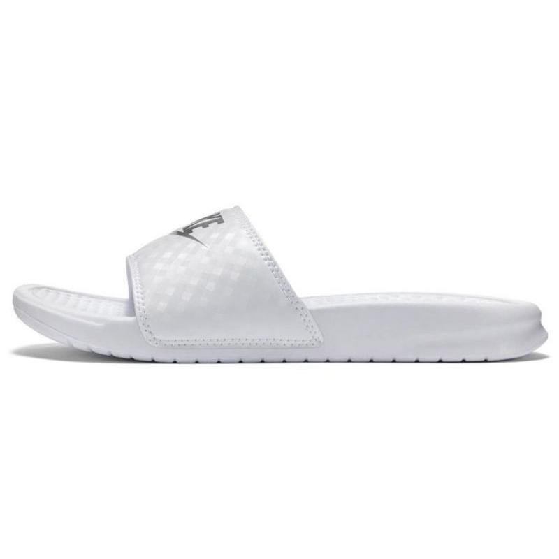 Nike Benassi Just Do It 343881 102 zehenstegsandalen – klassische, bequeme und universelle weiße Damen-zehenstegsandalen. Perfekt für Sommer, Strand, Pool und alltäglichen, lässigen Stil. Der schlichte „Slide“-Schnitt sorgt für schnelles Anziehen und das minimalistische Design mit klarem Branding unterstreicht den sportlichen Charakter der Marke Nike.