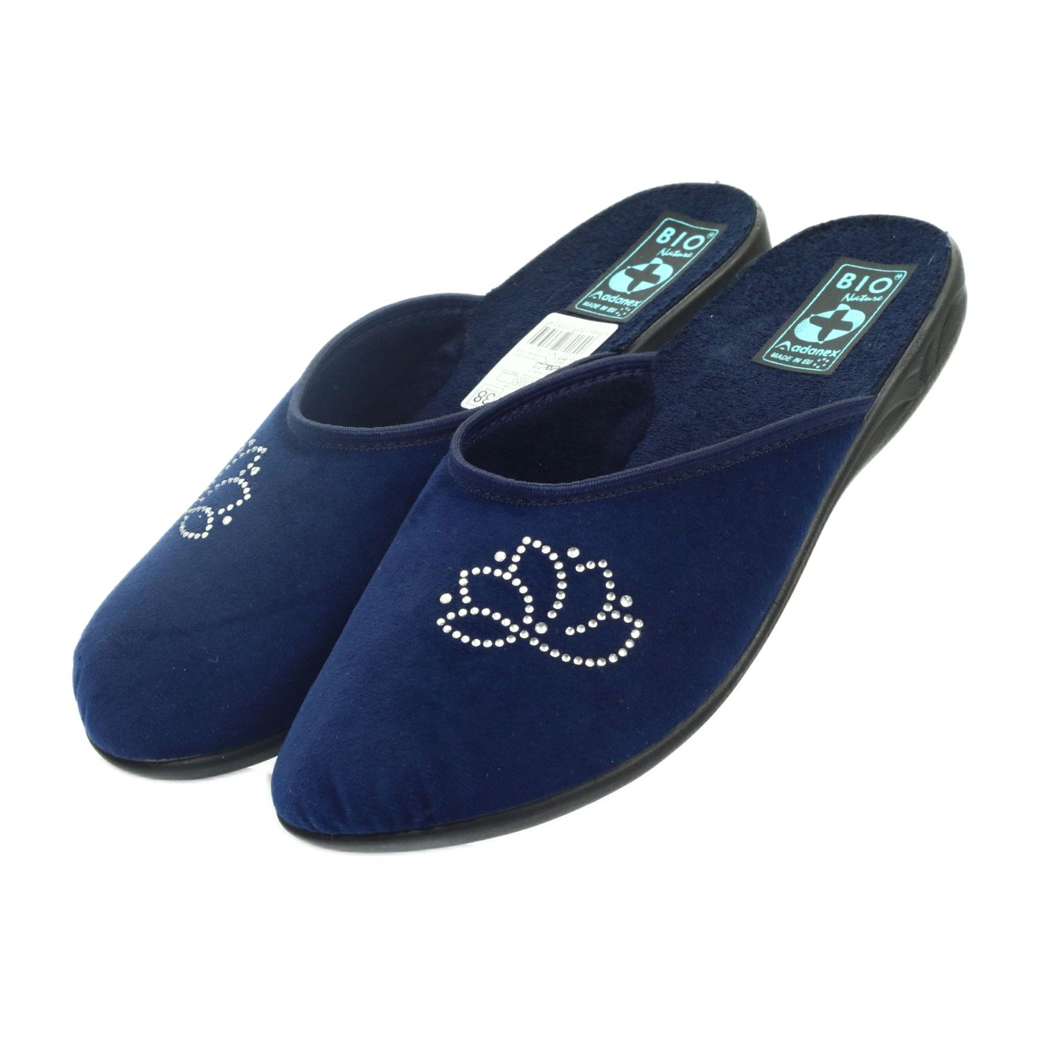 Adanex-Samthausschuhe mit Pailletten sind die perfekte Wahl für Frauen, die zu Hause Wert auf Komfort und Eleganz legen. Das Modell 23353 in Marineblau ist eine Kombination aus hochwertigem Baumwollstrick und dezenten Zirkonen, die ihm einen einzigartigen Glanz verleihen.