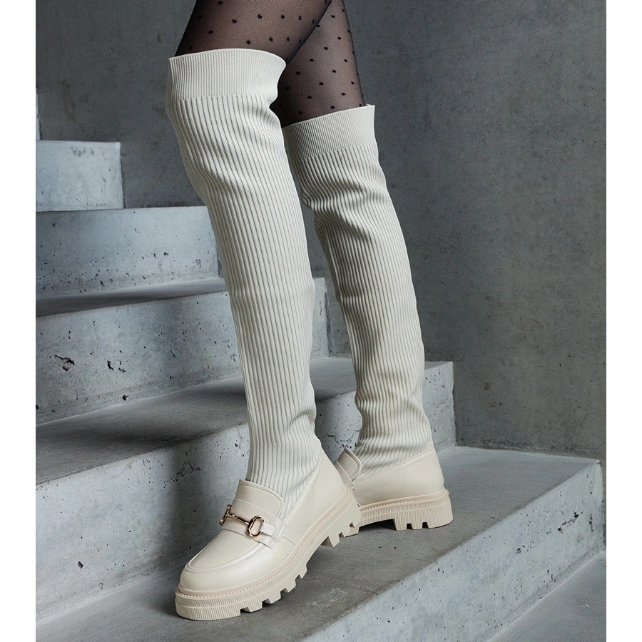 Diese Stiefel zeichnen sich durch eine subtile leichte Beigefarbe aus, die perfekt zu verschiedenen Stylisationen passt, sowohl täglich als auch für besondere Anlässe. Das flexible Obermaterial bietet nicht nur eine perfekte Passform, sondern auch den Komfort, den ganzen Tag zu tragen. Dank des runden Zehs und der Höhe über dem Knie fügt dieses Modell Eleganz und weiblichen Stil hinzu.