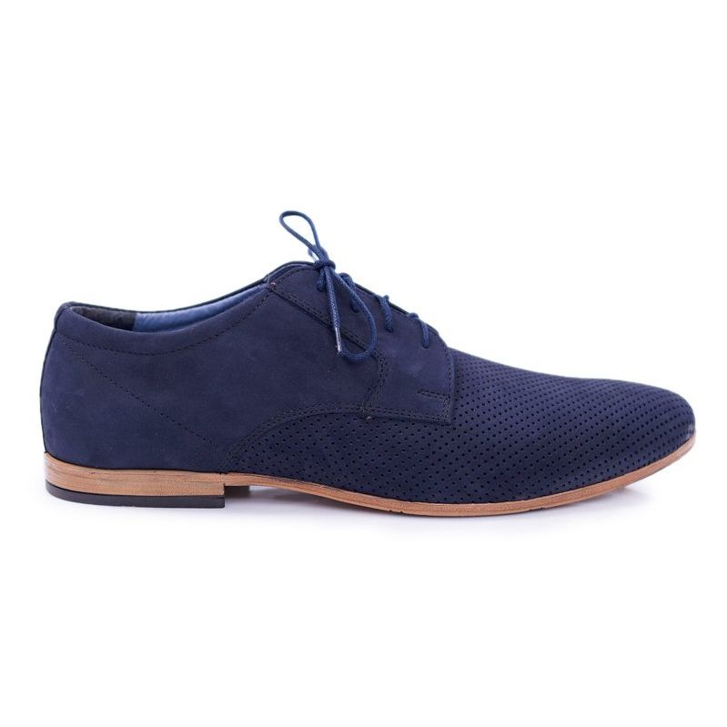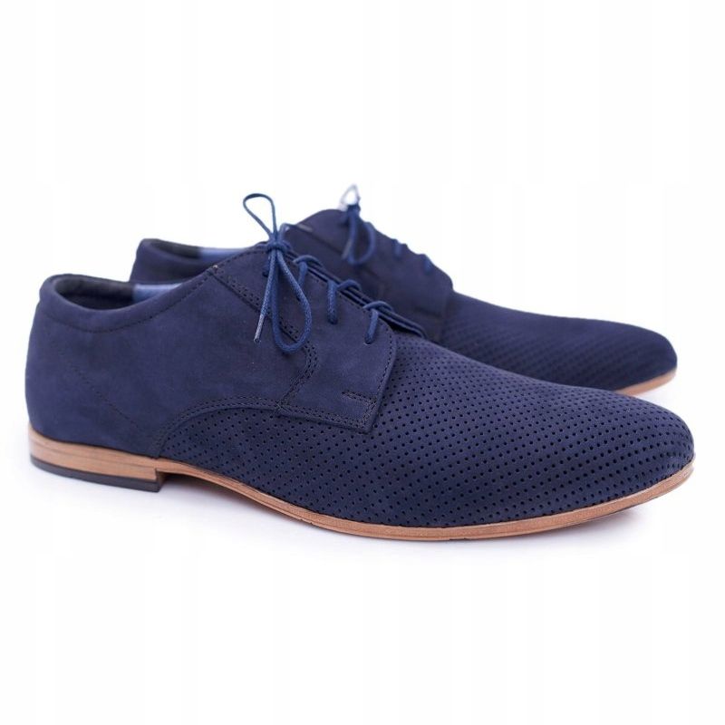 Lernen Sie die formellen Schuhe von Bednarek kennen, die Eleganz mit Komfort verbinden! Diese marineblauen, durchbrochenen Herrenschuhe sind aus Nubukleder höchster Qualität gefertigt, was nicht nur ein attraktives Aussehen, sondern auch Haltbarkeit und Tragekomfort garantiert. Das Hermes-Modell passt perfekt zu aktuellen Modetrends und behält einen klassischen Stil bei, der zu vielen formellen und ungezwungenen Anlässen gut passt.
