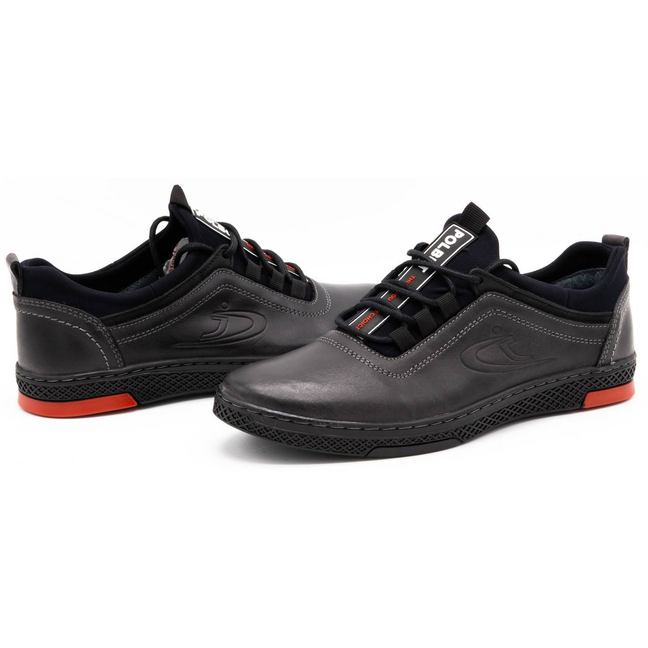 Polbut K24 - Graue Lederschuhe für Männer - jeden Tag perfekt. Die Kombination von Klassikern und Komfort: Der obere und der Einsatz aus natürlichen Leder sorgt für Haltbarkeit und gute Belüftung, und das leichte Design garantiert den ganzen Tag aus Komfort.