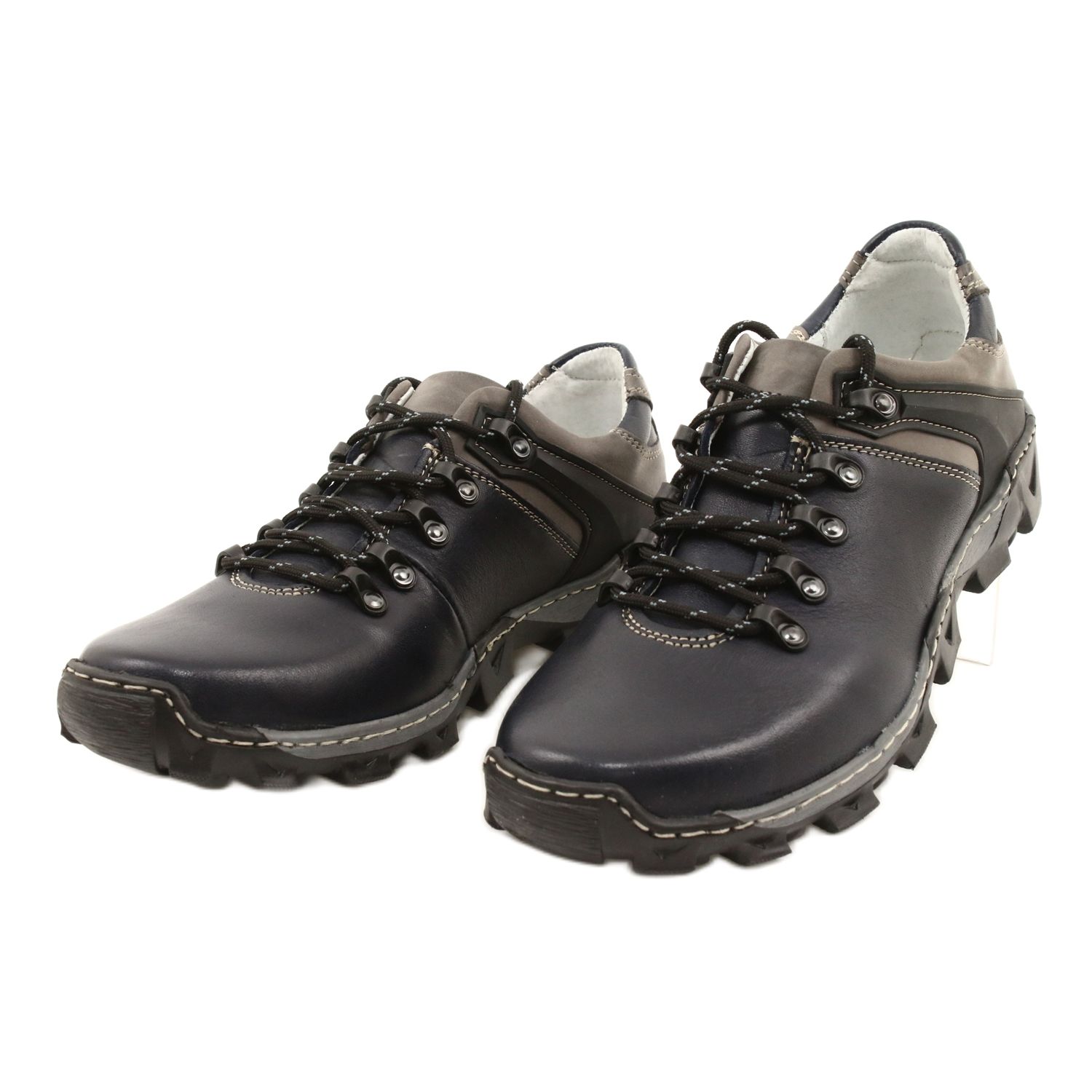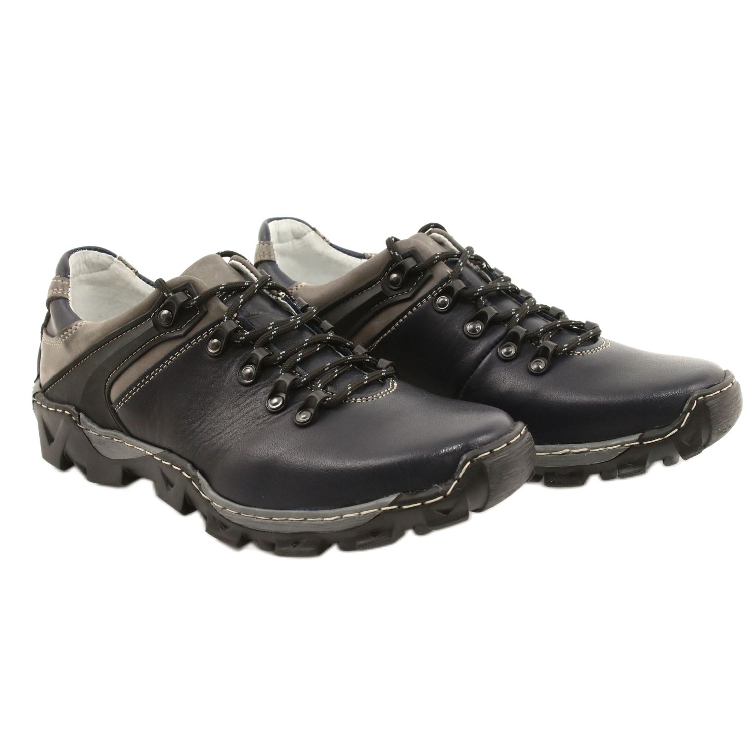 Wir präsentieren Herren-Trekkingschuhe aus Leder 116 der Marke Bednarek Polish Shoes, die Funktionalität und elegantes Design vereinen. Diese marineblauen und grauen Schuhe sind die perfekte Wahl für Männer, die Wert auf Komfort und Stil im Alltag legen.