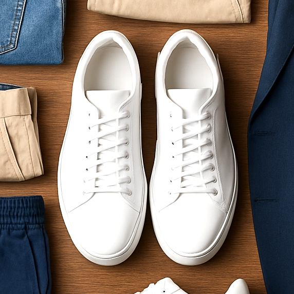 Dies ist die absolute Basis einer Herrengarderobe. Weiße, minimalistische Sneaker passen zu allem – von der Jeans bis zum Anzug. Sie sind sauber, frisch und vielseitig. Must-have: weißer Adidas Stan Smith, Nike Air Force 1, Common Projects Achilles Low.