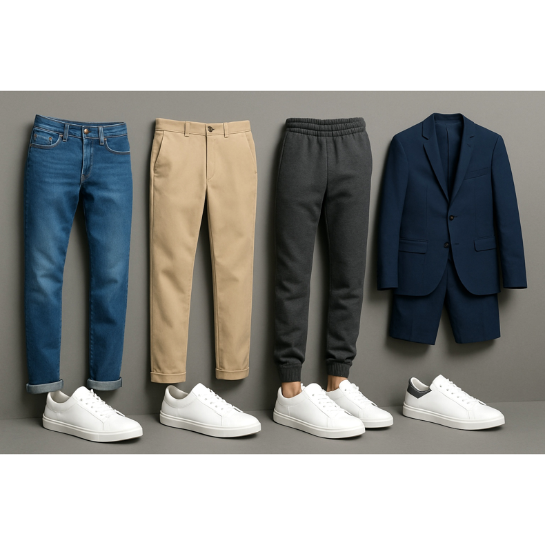 Elegant und bequem – Chinos in Beige, Marineblau oder Oliv passen perfekt zu minimalistischen Sneakers. Diese Smart-Casual-Kombination ist perfekt für Arbeit und Meetings.