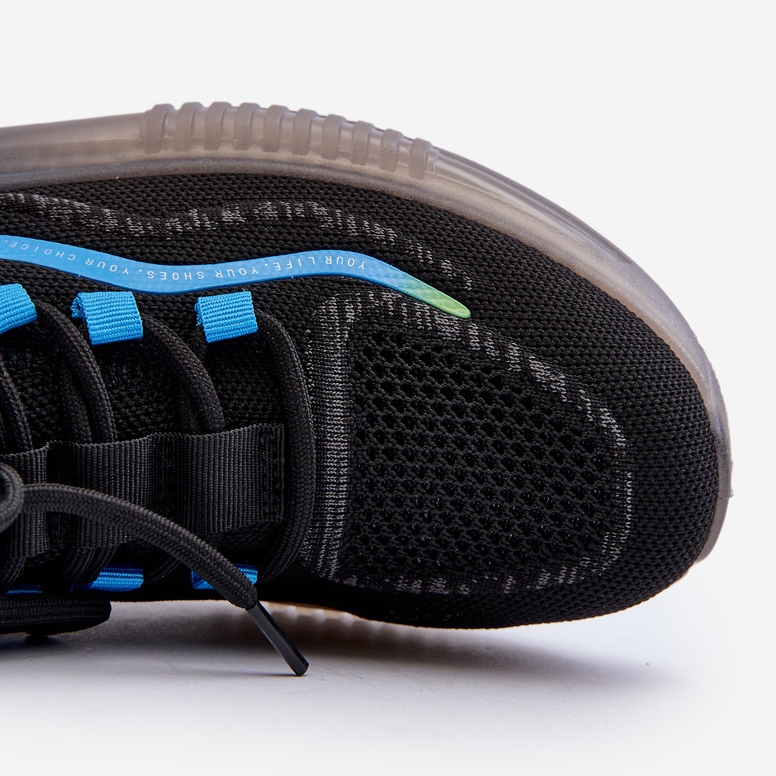 Das Modell ist durch die geringe Höhe des Oberen gekennzeichnet, die seinen sportlichen Charakter betont. Dank der Schnürung werden Sie die Schuhe an Ihren Fuß anpassen, was eine perfekte Passform darstellt. In Kombination mit minimalistischem, schwarzem Design und blauen Akzenten passen die Schuhe perfekt in aktuelle Trends.