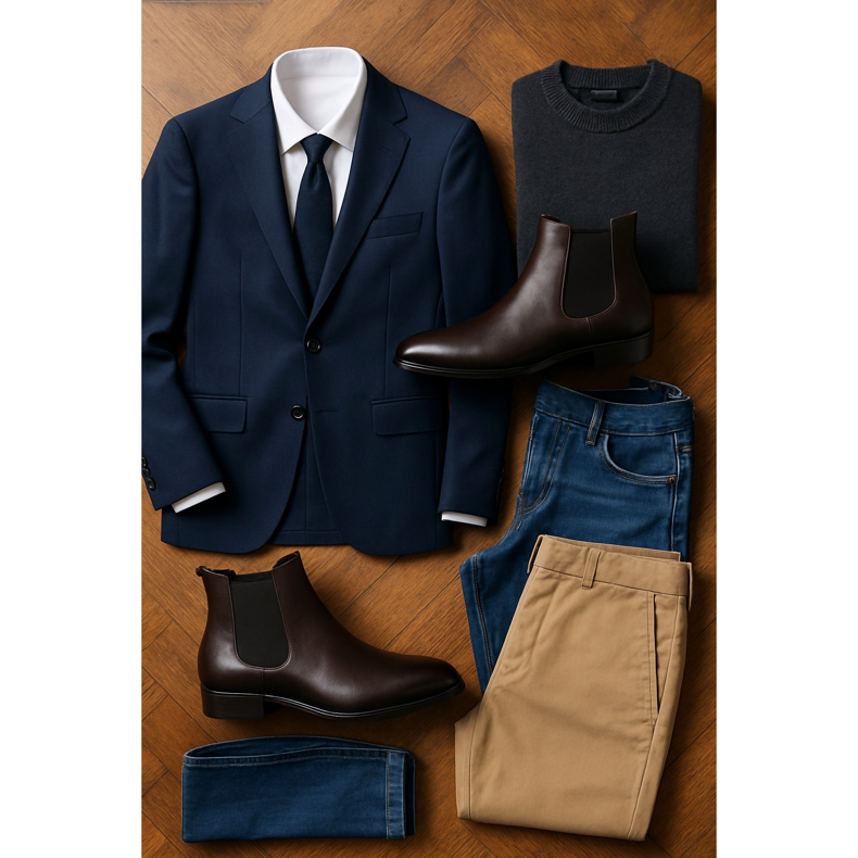 Schwarze oder dunkelbraune Chelsea-Stiefel passen perfekt zu Anzügen in den Farbtönen Marineblau, Grau und Schwarz. In den kälteren Monaten ist es eine elegante Alternative zu klassischen Oxfords. Vermeiden Sie wuchtige Modelle – entscheiden Sie sich für schlanke, minimalistische Chelsea-Modelle.