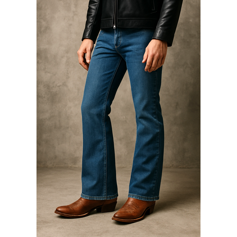 Bootcut- und Flare-Jeans zeichnen sich durch eine Verlängerung vom Knie abwärts aus und sind speziell für High-Top-Schuhe konzipiert. Die besten Passformen sind: Cowboystiefel (Westernstiefel), Chelsea-Stiefel, Jodhpurstiefel, Worker-Stiefel, hohe Schnürstiefel. Die Beine sollten den Schaft bedecken und leicht über den Schuh fallen. Vermeiden Sie niedrige Turnschuhe – sie sehen unter Hosen mit weitem Bein verloren aus. Dunkle Bootcut-Jeans mit schwarzen Chelsea-Boots und einer Lederjacke ergeben einen rockigen Look. Helle Schlaghosen mit braunen Cowboystiefeln verleihen dem Styling einen Boho-Country-Touch. Dieser Jeansschnitt erfreut sich in der modernen Herrenmode wieder großer Beliebtheit.