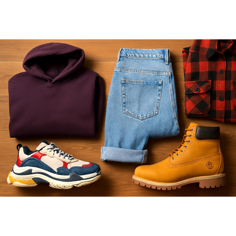 Baggy-, Relaxed-Fit- oder Carpenter-Jeans erfordern voluminöseres Schuhwerk, das eine weite Silhouette ausgleicht. Perfekt wären: klobige Turnschuhe (Balenciaga Triple S, Nike Air Max), hohe Stiefel, Dr. Martens, Timberland-Stiefel, Arbeitsstiefel, Kampfstiefel, dicke Skateboardschuhe. Zu feines Schuhwerk geht unter weiten Beinen verloren. Das Hochkrempeln der Beine lässt das Styling gewollter wirken. Streetwear-Look: übergroße Jeans + klobige Turnschuhe + übergroßer Kapuzenpullover. Workwear-Stil: Carpenter-Jeans + Timberland-Hose + Flanellhemd.