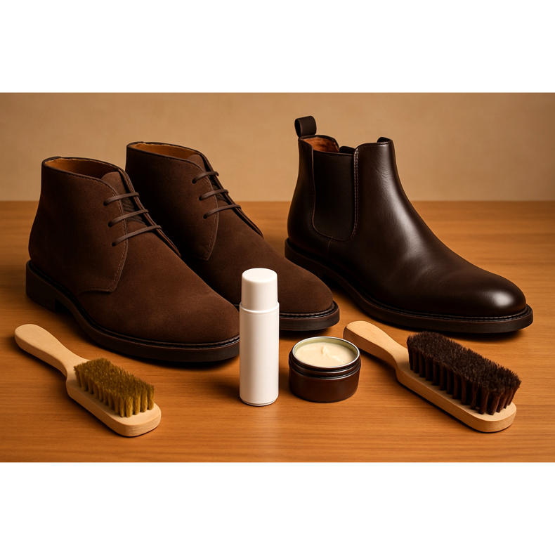 Messingbürste, Imprägnierspray, Wildlederauffrischer. Tragen Sie es nicht ohne Imprägnierung im Regen.