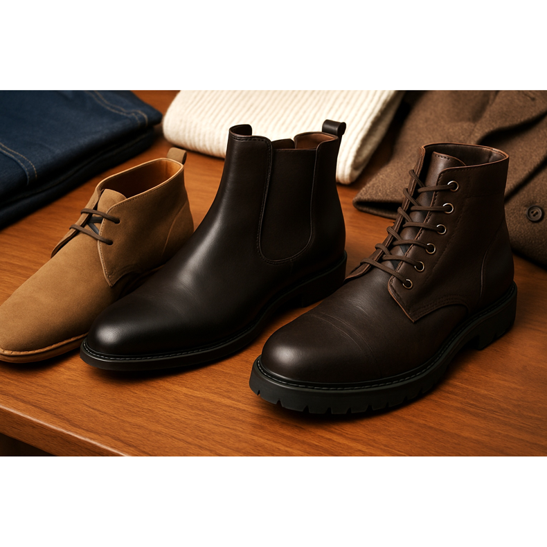 Stiefeletten sind eine Kategorie, die verschiedene Stile umfasst: Chelsea-Stiefel, Stiefeletten, Chukka-Stiefel, Chelsea-Stiefel. Hauptmerkmal: Der Schaft reicht bis über den Knöchel (5-10 cm darüber). Vorteile: Unterstützung des Sprunggelenks, Schutz vor Kälte, Universalität (Eleganz + Funktionalität), gute Passform bei langen und knielangen Hosen.