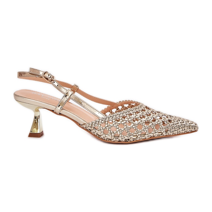 Wir präsentieren elegante High Heels mit einer spitzen Nase und einer offenen Ferse in einer phänomenalen goldenen Farbe, die jeden Abend perfekt ergänzt. Dieses einzigartige Modell, das mit einer Schnalle befestigt ist, bietet eine perfekte Anpassung an den Fuß, was nicht nur Komfort, sondern auch bei jedem Schritt zu Vertrauen garantiert.