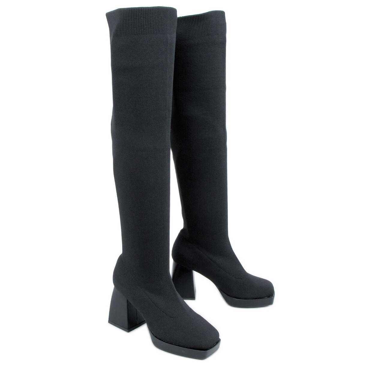 Aus elastischem, sockenähnlichem Stoff gefertigt, schmiegen sie sich perfekt an das Bein an, sodass jeder Schritt zum reinen Vergnügen wird. Die quadratische Spitze und der Designer-Absatz von 9,5 cm verlängern die Beine optisch und der breite Absatz sorgt für Stabilität, sodass Sie sie den ganzen Tag lang tragen können, ohne sich um Unbehagen sorgen zu müssen.