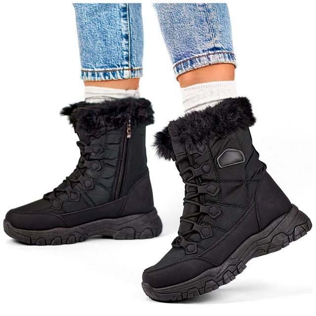 Die Höhe der oberen 17 cm und Standard -Sting wird durch eine perfekte Passform für jedes Bein garantiert, und das Ökofell in den Schuhen bietet zusätzliche Wärme und Tragekomfort. Dank einer flachen Plattform von 4 cm hoch und einer soliden Sohle werden Sie die Stabilität auf schwierigem Gelände beibehalten. Schwarzes, minimalistisches Design ist Teil der aktuellen Trends, sodass Sie sie problemlos mit verschiedenen Winterstilisationen anpassen können.
