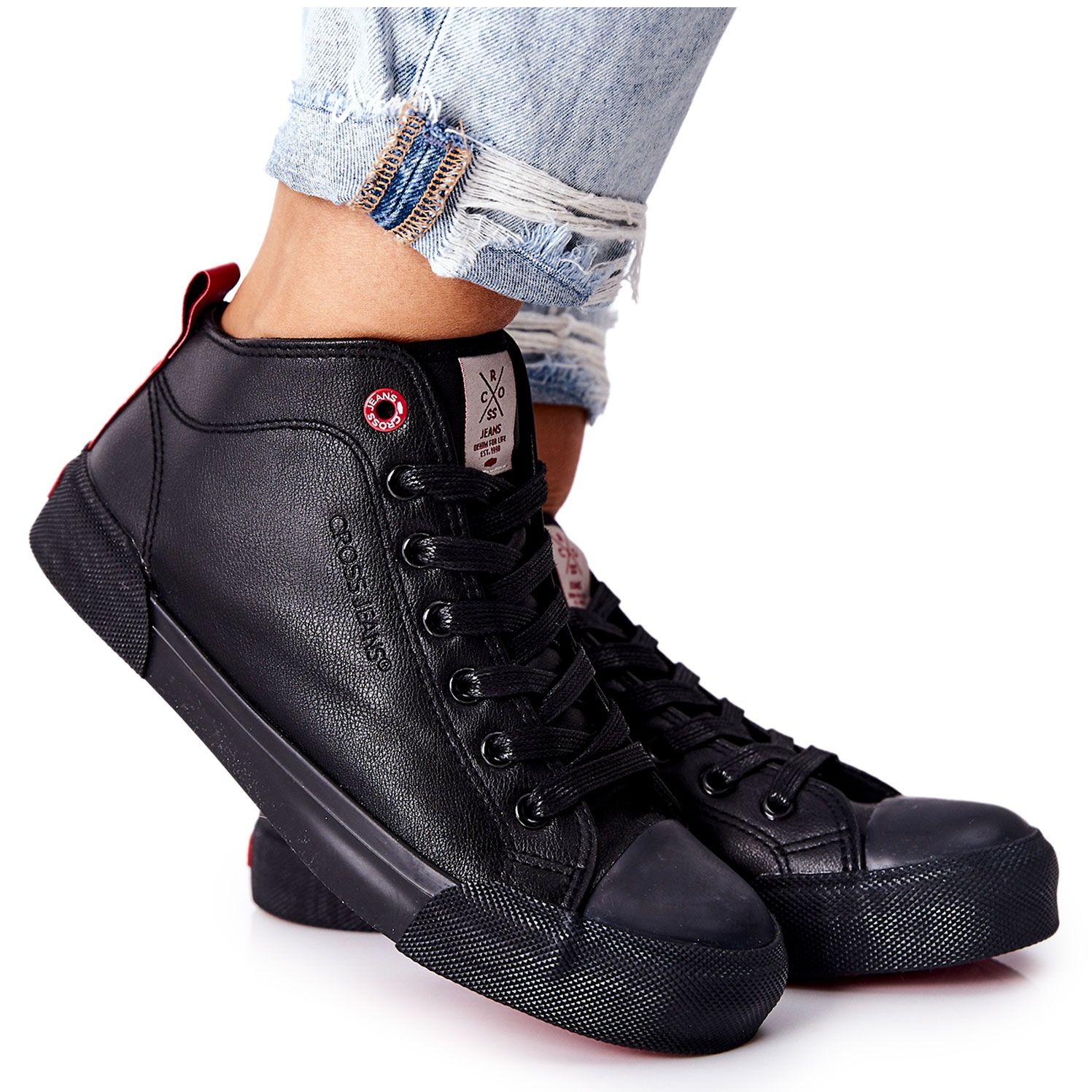 Frauen High -Sneaker Cross Jeans II2R4032C - Ein Klassiker in einer modernen Ausgabe. Schwarzes, minimalistisches Design und Knöchelvernichtungsmaterial des ökologischen Leders machen das Modell perfekt zu den täglichen, städtischen Stylisationen - vom Gehen durch die Stadt bis hin zu Treffen mit Freunden. Dank des höheren Oberen funktionieren die Schuhe auch an kühleren Tagen.