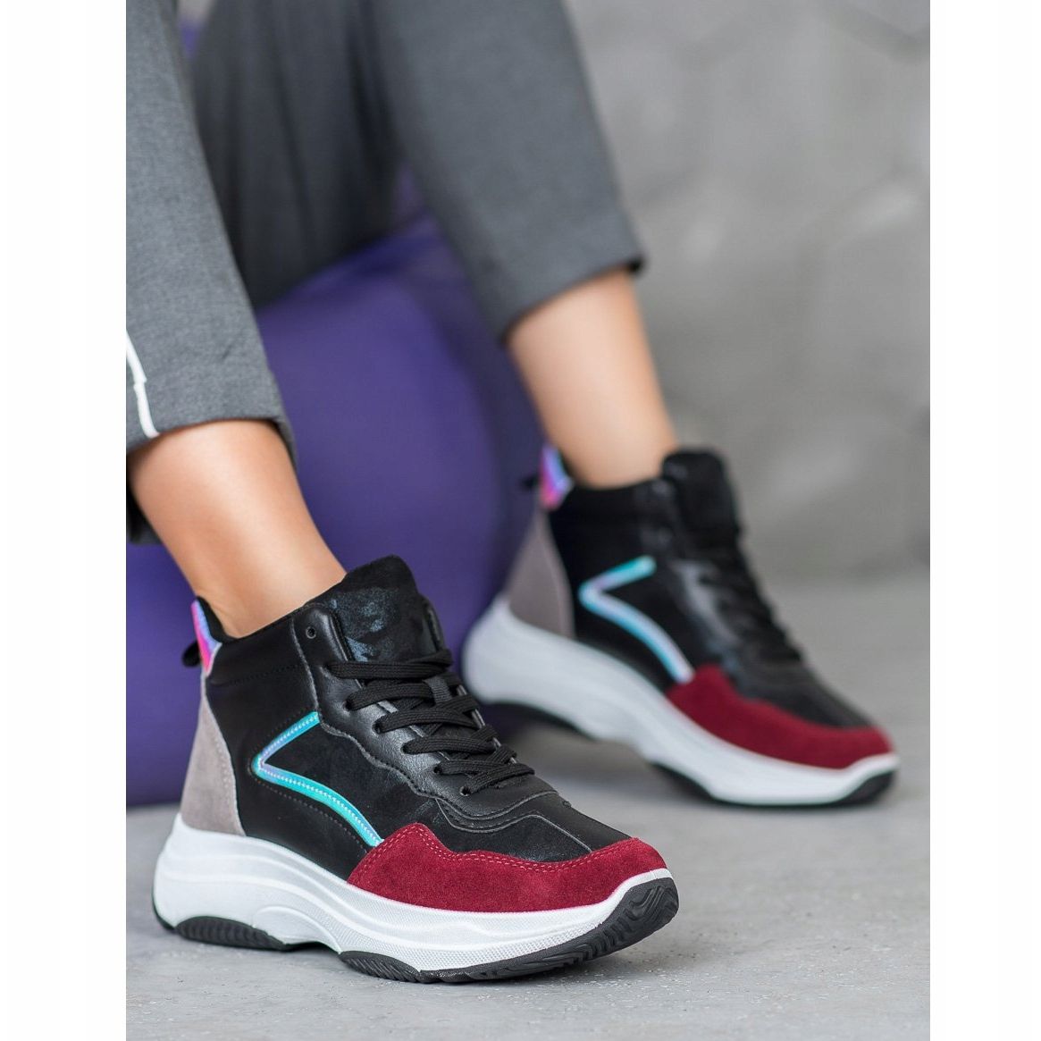 Diese einzigartigen Damen-Sportschuhe wurden mit Liebe zum Detail entworfen. Der äußere Teil des Obermaterials besteht zur Hälfte aus elastischem Stoff und zur Hälfte aus hochwertigem lederähnlichem Material, was nicht nur für einen modischen Look, sondern auch für Langlebigkeit sorgt. Eine stilvolle Farbkombination mit einem burgunderfarbenen Materialstreifen an der abgerundeten Spitze verleiht den Schuhen Charakter und lässt sie perfekt zu verschiedenen Stilen passen.