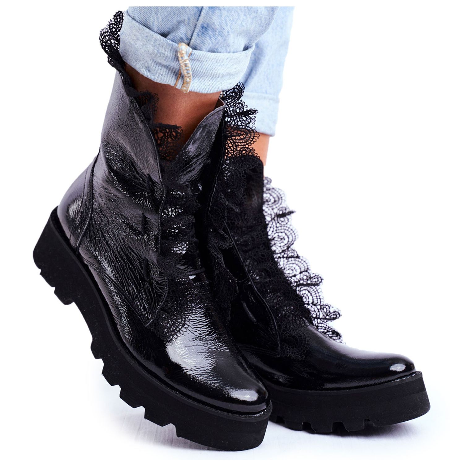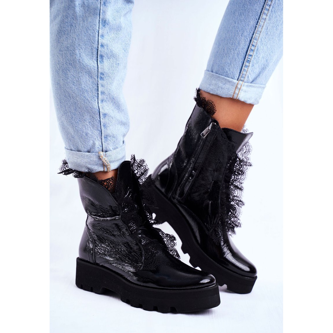 Stiefel aus natürlichem Lackleder sind am Obermaterial mit dekorativer Spitze verziert, was ihnen einen einzigartigen Charakter verleiht. Der bequeme Einsatz aus Naturleder sorgt für hervorragende Belüftung und Komfort, sodass Sie sie viele Stunden lang tragen können, ohne Beschwerden zu verspüren.