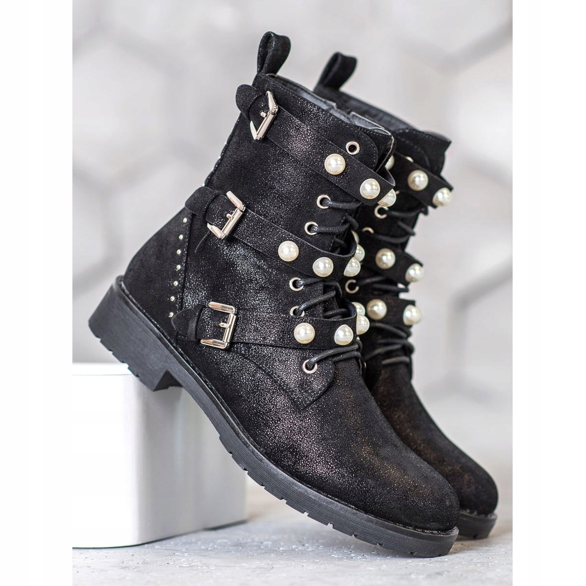 Diese stylischen Stiefel verfügen über eine Schnürung vorne und einen praktischen Reißverschluss an der Seite, was das An- und Ausziehen erleichtert. Zusätzlich wird ihr ursprüngliches Aussehen durch Gürtel mit Schnallen unterstrichen, die mit Perlen und kleinen glänzenden Strasssteinen verziert sind und ihnen einen rockigen Charakter verleihen.