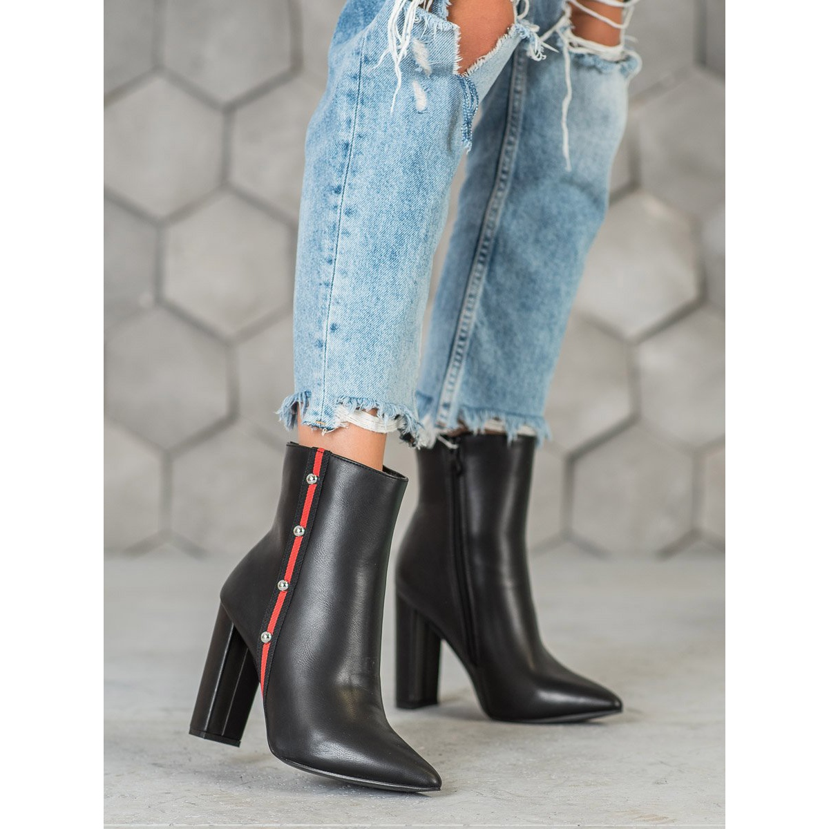 Ein interessantes Designelement ist der dekorative rote Streifen an der Seite, der den Schuhen einen einzigartigen Charakter verleiht. Auch die angebrachten Perlen sind ein Hingucker und sorgen für einen dezenten Glanz. Dank des eingearbeiteten, weichen Absatzes und Reißverschlusses bieten diese Schuhe Komfort und lassen sich leicht anziehen.