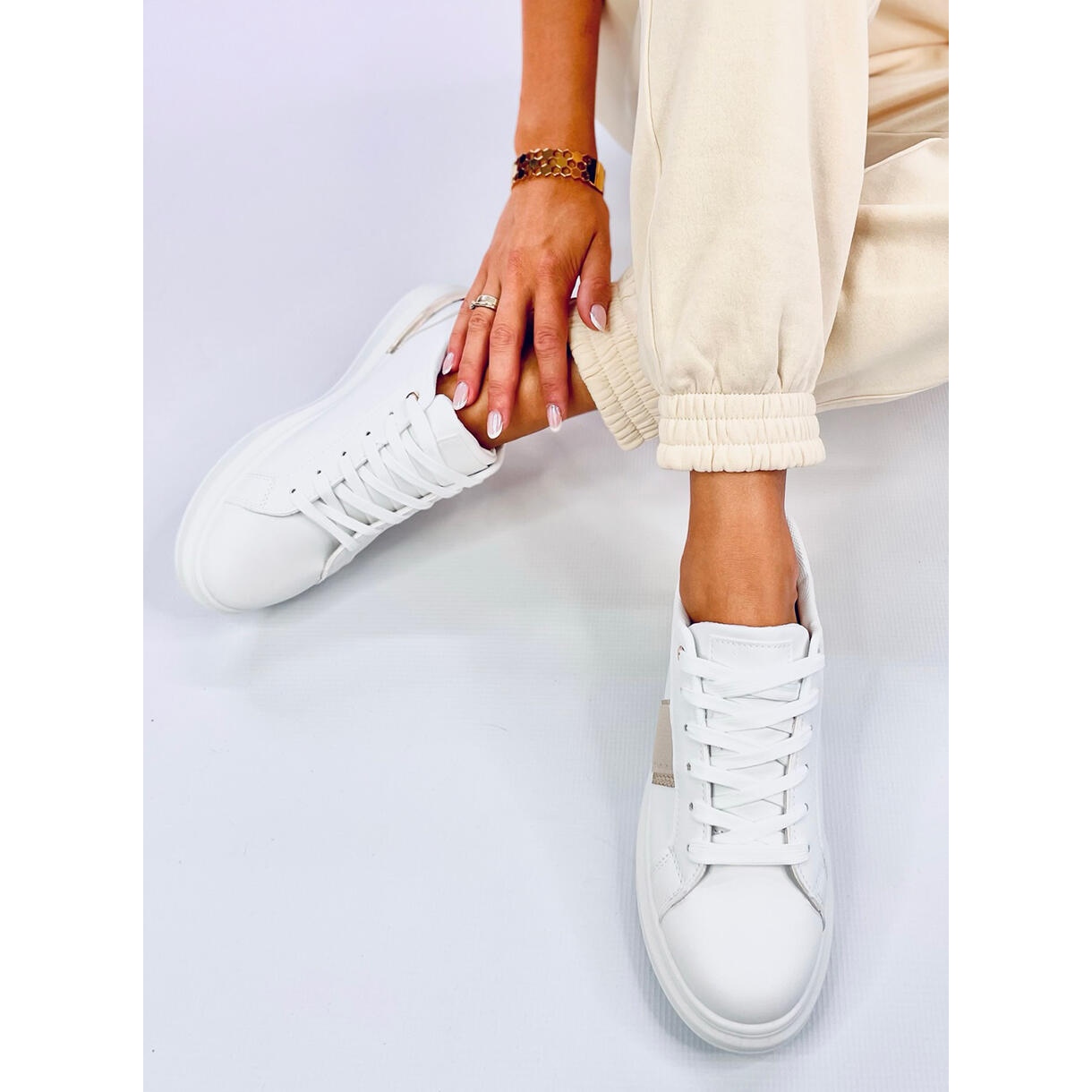 Turnschuhe auf der Holms-Plattform in White sind ein absolutes Muss in der Garderobe jeder modernen Frau. Diese einzigartigen Schuhe kombinieren viele Texturen und Materialdesigns, wodurch sie sich von anderen Modellen abheben. Der Goldeinsatz in der Sohle gibt ihnen Eleganz und Originalität und betont ihren einzigartigen Charakter.