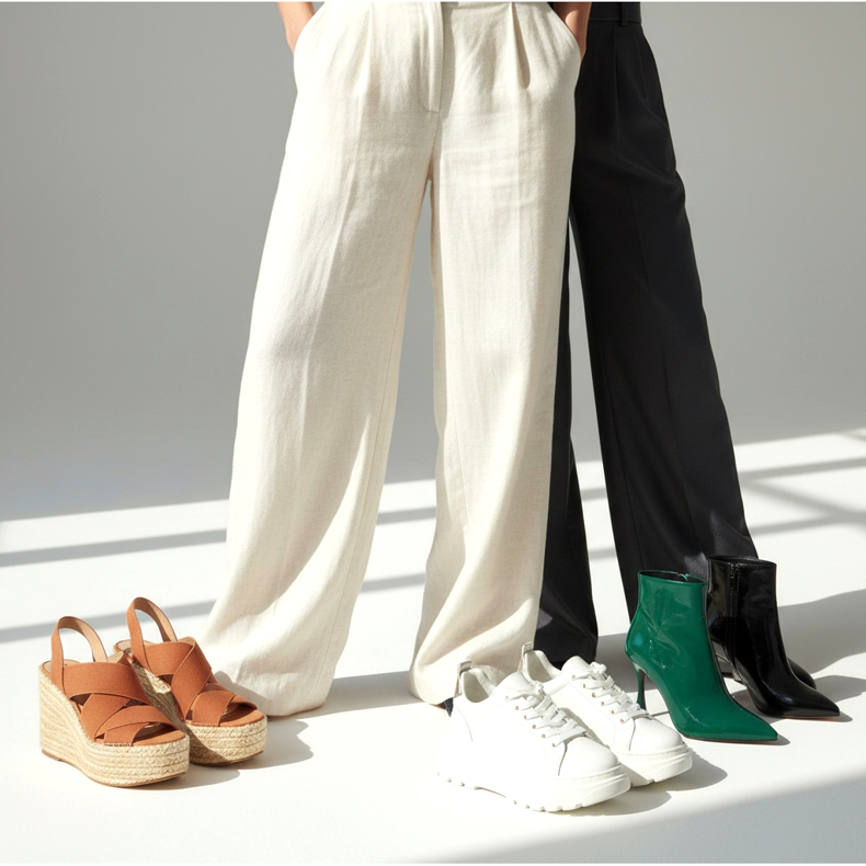Nicht jeder Schuh sieht zu einer Hose mit weitem Bein gut aus. Ballerinas mit flacher Sohle und langem, weitem Bein sind eine Kombination, die die Silhouette optisch verkürzen kann – sofern die Hose nicht richtig bis zum Knöchel gekürzt wird. Dasselbe passiert auch bei niedrigen Sneakers, die unter langen Hosenbeinen verloren gehen und den Gesamteffekt stören.