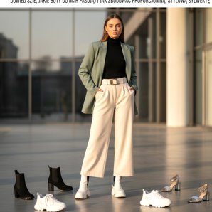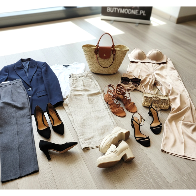 Es lohnt sich auch, auf viele gerahmte, massive Schuhe zu verzichten und stattdessen auf elegante Schuhe mit weitem Schaft aus zartem Material zu setzen – der Kontrast zwischen schweren Schuhen und leichtem Stoff kann unerwartet ungünstig sein. Passend zu Hosen: Leichter Stoff mag einen leichten Partner, und schwererer Denim verträgt voluminöseres Schuhwerk.