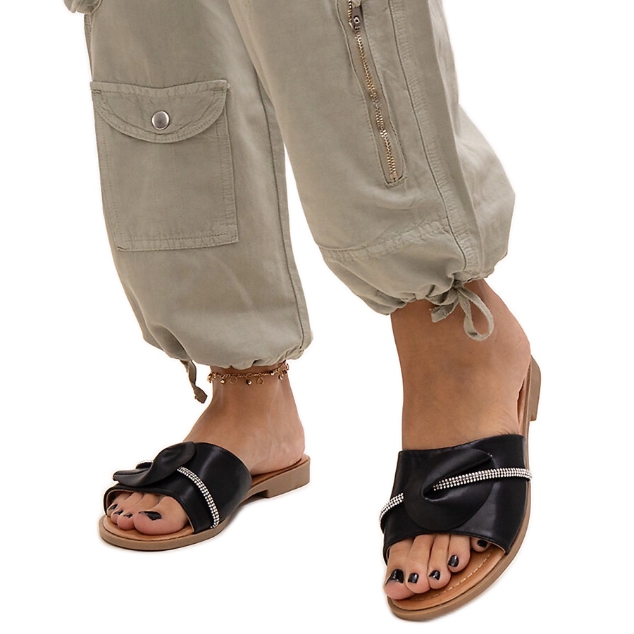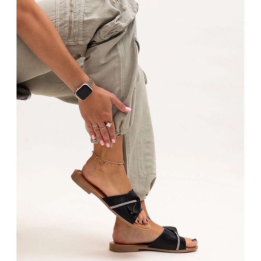 Treffen Sie die Flip -Flops mit einem Gürtel mit Amarari -Zirkonen in einer eleganten schwarzen Farbe. Es ist die perfekte Wahl für heiße Sommertage und kombiniert modisches Design und Komfort des Tragens. Dank des runden Zehs und der eingefügten Struktur mit Gummistreifen wird das Anziehen und Abnehmen der Klappen extrem einfach.