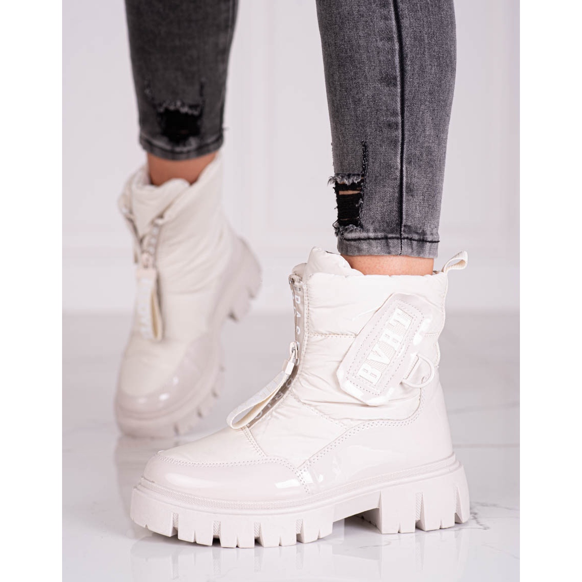 Die Breite des Schafts beträgt 26 cm und die Höhe 16 cm, wodurch sich der Arbeiter perfekt an den Knöchel anpasst und ihn vor Kälte schützt. Durch die beige Farbe lassen sich die Schuhe problemlos mit verschiedenen Stilrichtungen kombinieren, von lässig bis etwas eleganter.