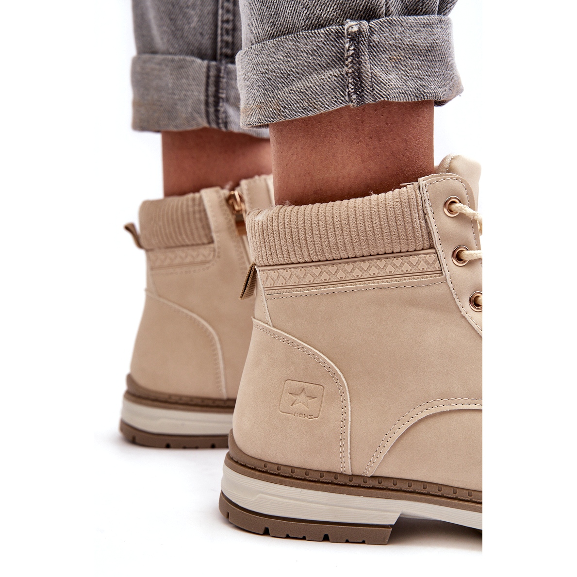 Diese Damenstiefel zeichnen sich durch eine zeitlose Ästhetik aus, die perfekt in jede Herbst-Winter-Garderobe passt. Diese aus hochwertigem beigem Faux-Wildleder gefertigten Schuhe sind nicht nur ästhetisch, sondern zeigen auch die Sorge des Herstellers um die Umwelt. Darüber hinaus ergänzt die solide braune Sohle nicht nur das Design, sondern sorgt auch für Stabilität und Haltbarkeit auf verschiedenen Untergründen.