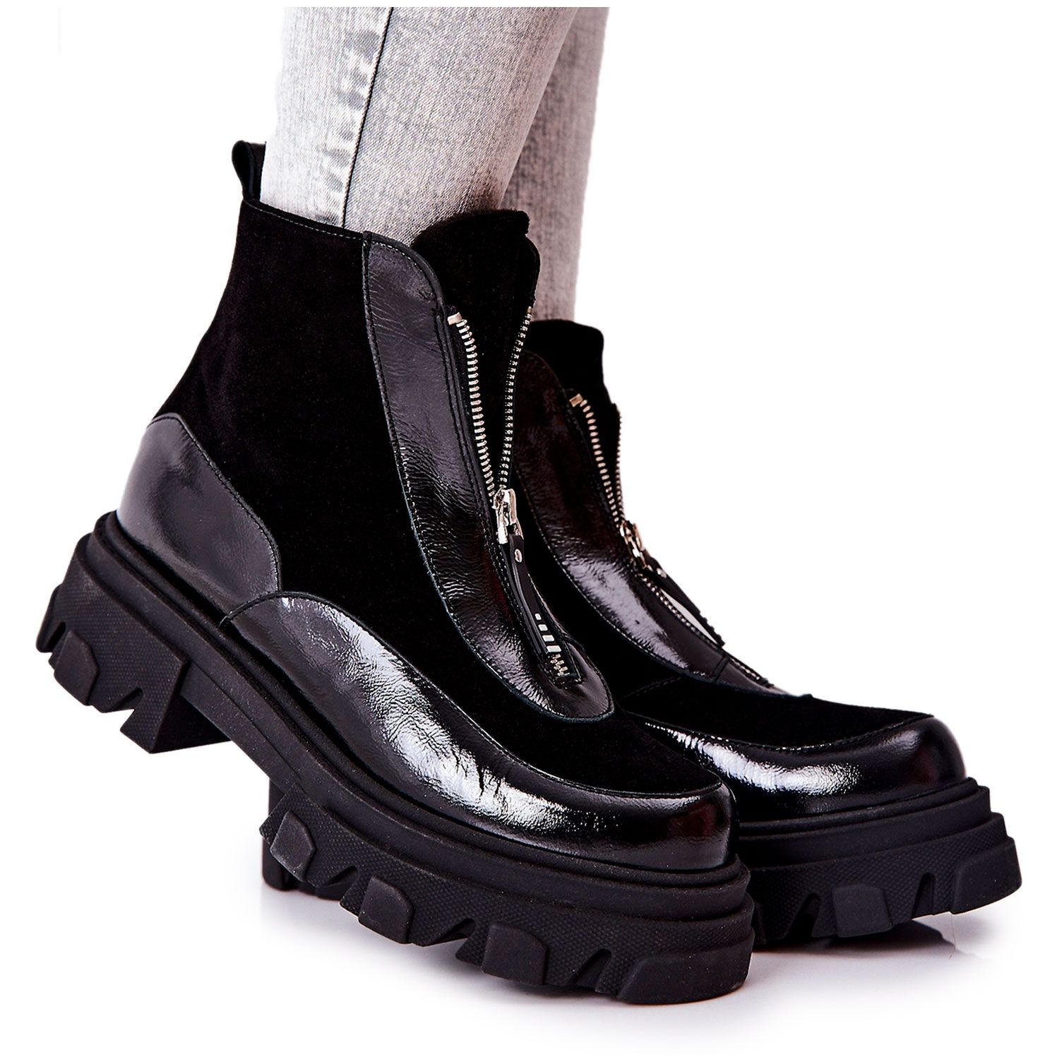 Die massive Sohle und der flache Absatz sorgen für Stabilität und Tragekomfort, die im verrückten Alltag notwendig sind. Die Stiefel sind vorne am Obermaterial mit einem praktischen Reißverschluss ausgestattet, der das An- und Ausziehen erleichtert. Dank sorgfältiger Verarbeitung und minimalistischem Design passen diese schwarzen Stiefeletten zu vielen Stilrichtungen – sowohl lässig als auch eleganter.