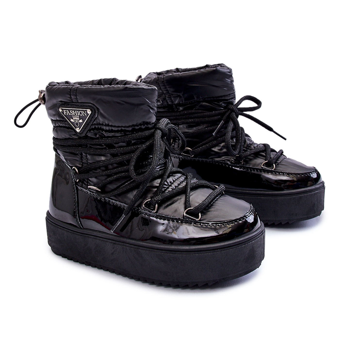 Praktische und stilvolle Schneestiefel für Mädchen, die während Winterspielen arbeiten werden. Sie bestehen aus wind- und frost bestehenden Materialien in Kombination mit ökologischem Leder, isoliert mit weichem Fell - sie bieten auch bei niedrigen Temperaturen Wärme und Komfort. Modell, das vorne mit dekorativer Schnürung und einer Kette oben auf dem oberen oberen Fit geschoben wurde. Auf eine 3,5 cm hohe Plattform modiert, die den Fuß von einem kalten und nassen Boden isoliert.