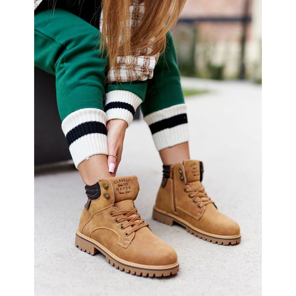 Die Stiefel werden mit einem praktischen Reißverschluss geschlossen und zusätzlich gebunden, was eine perfekte Passform am Fuß ermöglicht. Zarte Nähte an den Seiten und dekorative Prägungen auf der Zunge verleihen ihnen einen einzigartigen Charakter. Sie verfügen über eine rutschfeste Sohle, die die Sicherheit beim Gehen auch auf rutschigem Untergrund erhöht.