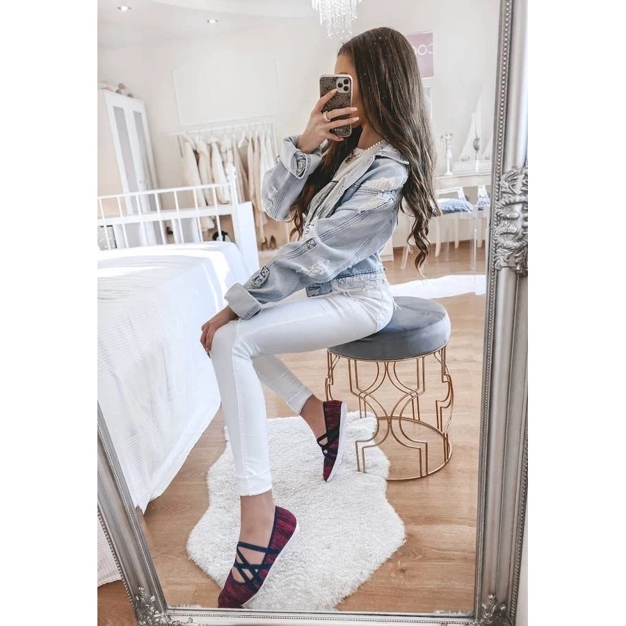 Ballerinas aus hochwertigem Stoff bieten Atmungsaktivität und Komfort, auch an den wärmsten Tagen zu tragen. Dekorative Gummibänder, die an der Sohle befestigt sind, stützen den Fuß effektiv und garantieren beim Gehen Stabilität.