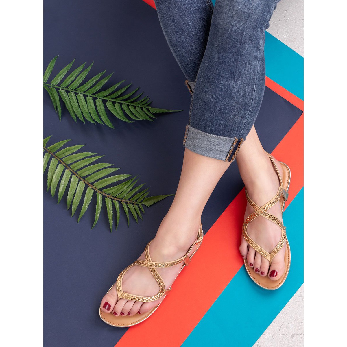 Das Schuhwerk hat einen offenen Absatz und eine Schnalle, was das An- und Ausziehen erleichtert. Die Sohle aus synthetischem Material ist glatt und langlebig und sorgt für Komfort bei jedem Schritt. Darüber hinaus verleiht die gelbe Farbe, angereichert mit goldenen Details, den zehenstegsandalen einen modischen und fröhlichen Charakter.