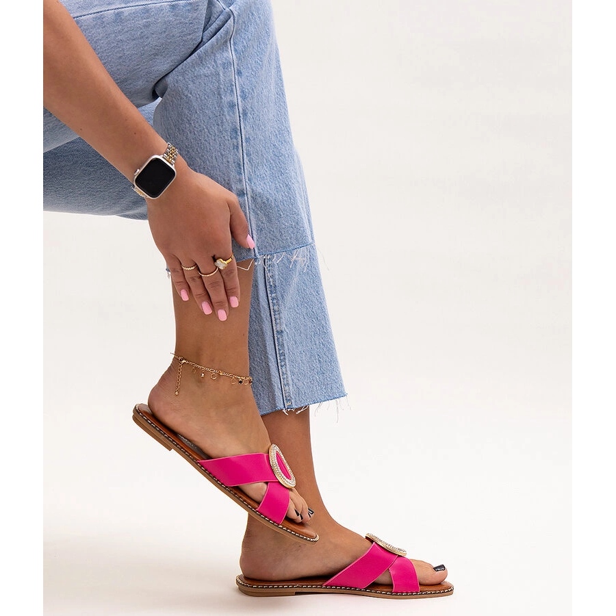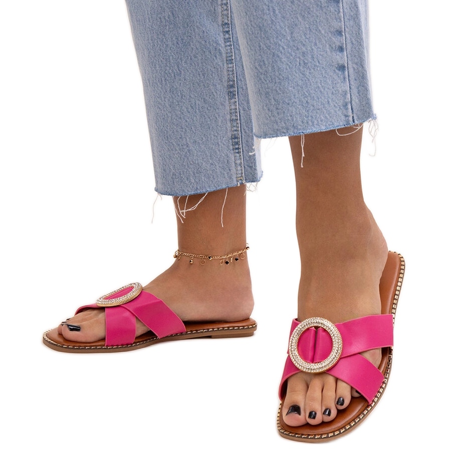 Hausschuhe mit einer Schnalle in den Salimba -Strasssteinen in Pink sind die perfekte Wahl für Sommertage, die Komfort mit modischem Stil verbinden. Ihr Slip -Design ermöglicht schnelles und bequemes Anziehen, was sie bei Urlaubsspaziergängen oder Entspannungen am Strand hervorragende Begleiter macht. Die runde Nase verleiht den Klappen einen modernen Look, der sicherlich Ihre Augen zeichnen wird.