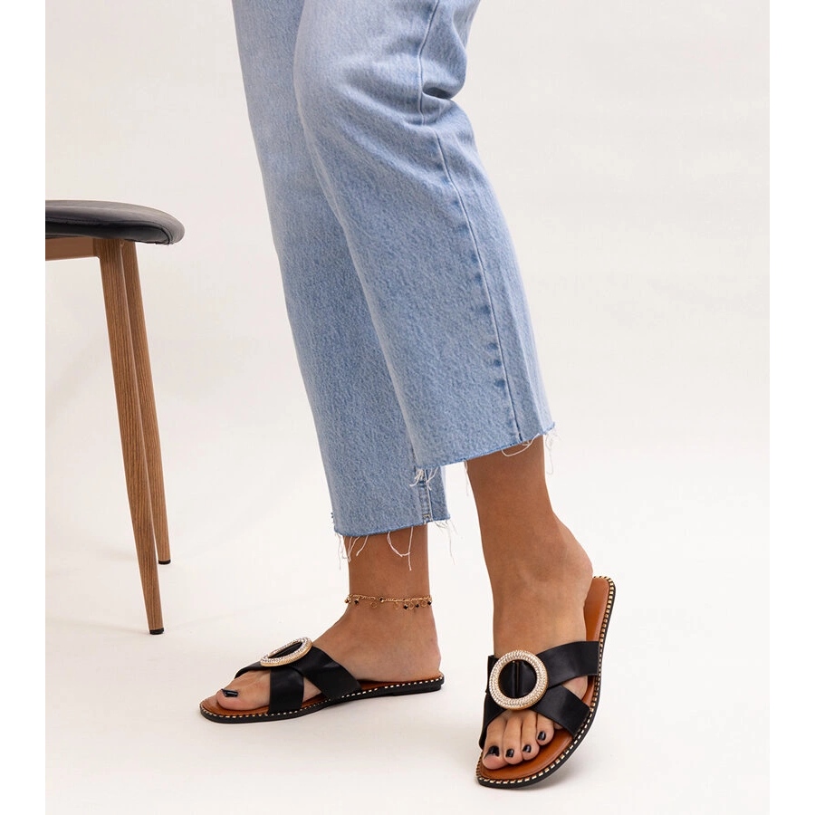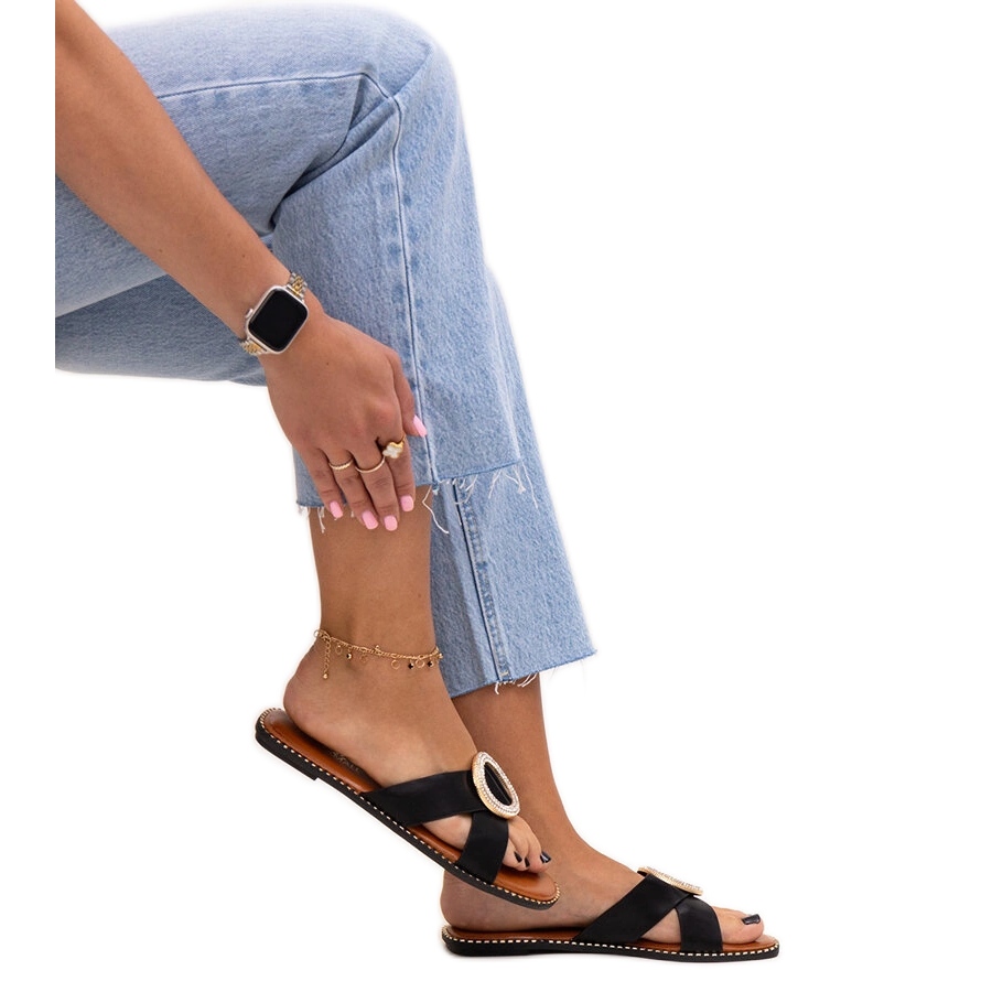 Entdecken Sie die einzigartigen Flip -Flops, die mit einer Schnalle in den Salimb -Strasssteinen in einer klassischen schwarzen Farbe dekoriert sind und ein hervorragender Vorschlag für heiße Sommertage sind. Diese stilvollen, eingeführten Flip -Flops kombinieren Komfort und Eleganz, dank der sie die perfekte Ergänzung zu Ihrer Sommerstilisierung darstellen werden.