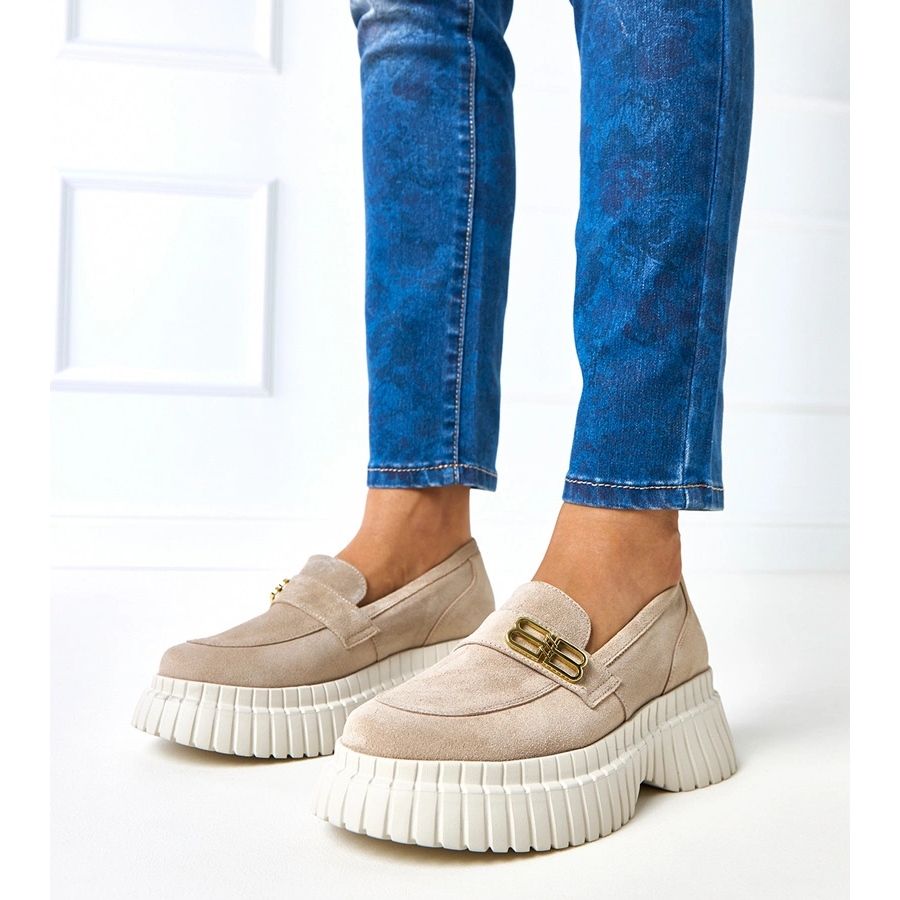 Beige Wildlederschuhe Karino ist eine perfekte Wahl für Frauen, die Stil und Komfort schätzen. Diese niedrigen Schuhe bestehen aus hochwertigem natürlichen Leder und sind nicht nur modisch, sondern auch sehr komfortabel. Ein runder Plastikzeh verleiht ihnen einen modernen Look, der perfekt für Sommerstilisationen geeignet ist.